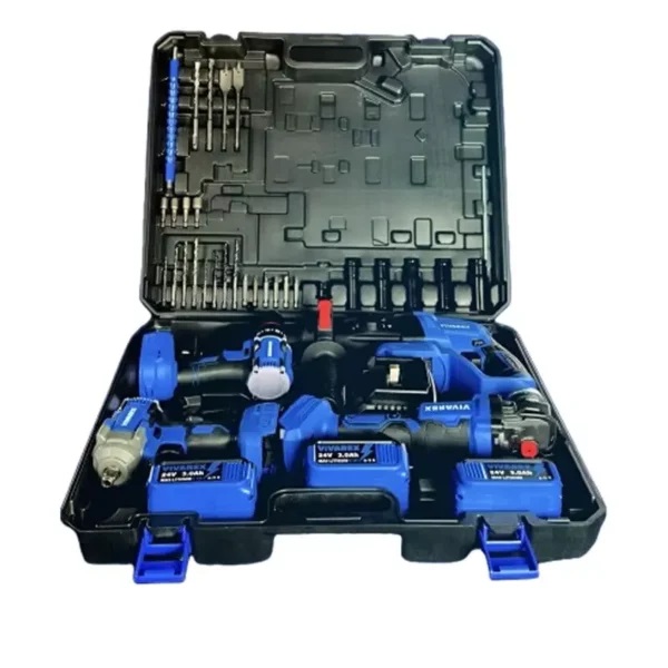 خرید کیت شارژی ۴ عددی براشلس ویوارکس مدل VR2404-BCK شامل دریل چکشی، دریل بتنکن، مینیفرز و بکس شارژی با موتور براشلس صنعتی، سه باتری ۲۴ ولت، شارژر سریع و کیف حمل مقاوم. مناسب نجاری، آهنگری و ساختوساز.